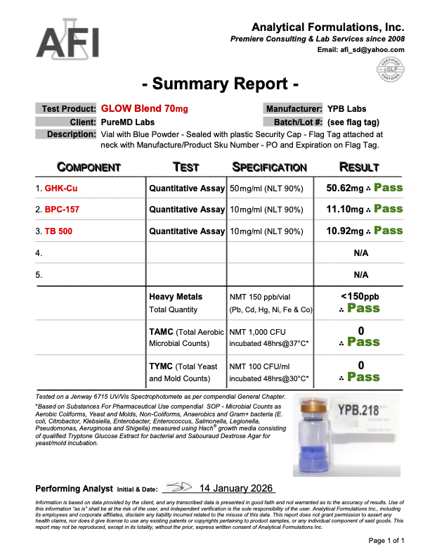 It is a glow peptide blend composed of three synthetic peptides—GHK-Cu, BPC-157, and TB-500 (thymosin beta 4 / thymosin β4)—commonly studied in laboratory research focused on tissue, cellular migration, collagen, and gene expression mechanisms.